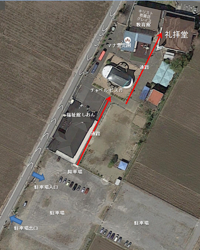 The site of Tsuchiura Megumi Church is situated between Route 6 Bypass and old National Route 6, with its front entrance facing the right bank of Sakura River, and Aeon Mall Tsukuba is in the back. Make sure to check the map attached.