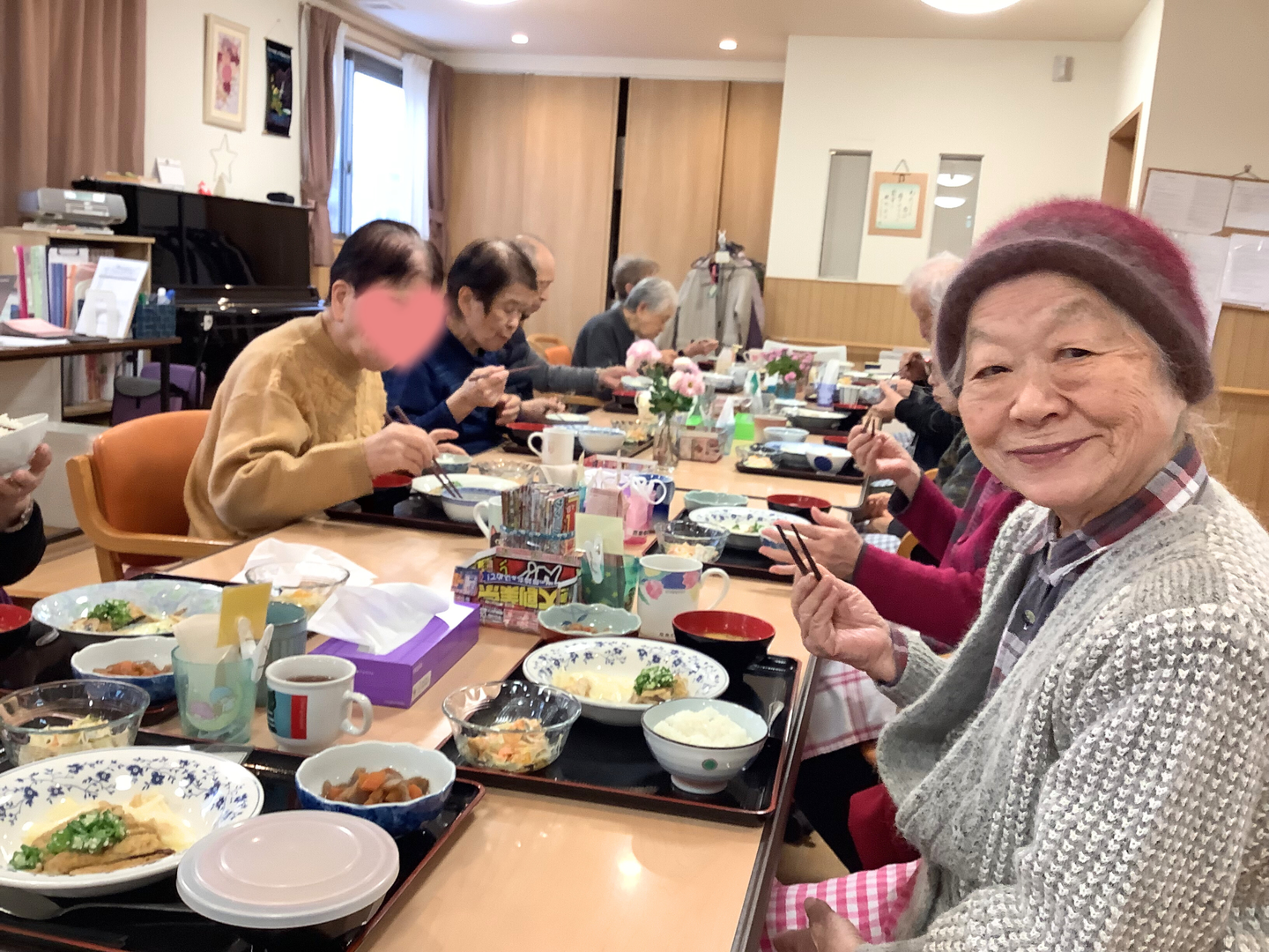 お食事は栄養バランスを考慮したメニューです。温かい手作りの食事をどうぞ!お身体の状態に合わせて、使い易い食器もご用意しています。テーブルを囲んで、楽しく美味しく昼食タイムを過ごしましょう。