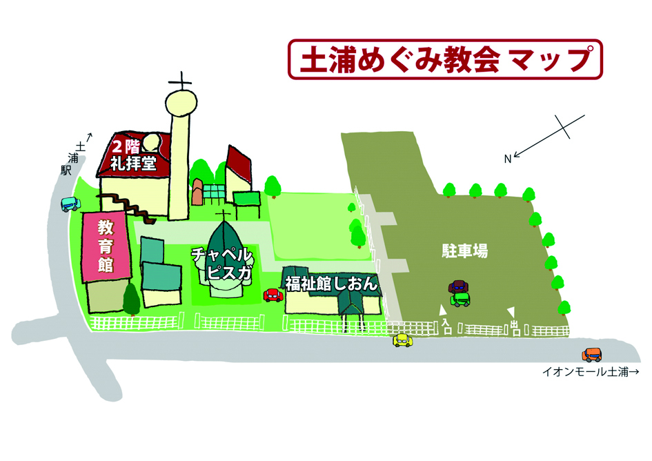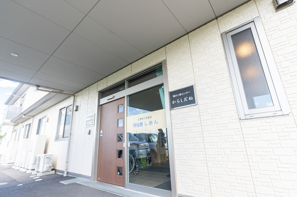 からしだねは、土浦めぐみ教会敷地内「福祉館しおん」にあります。6号バイパスと旧国道6号線の間に位置し、イオンモール土浦の北側、桜川の土手沿いにあります。